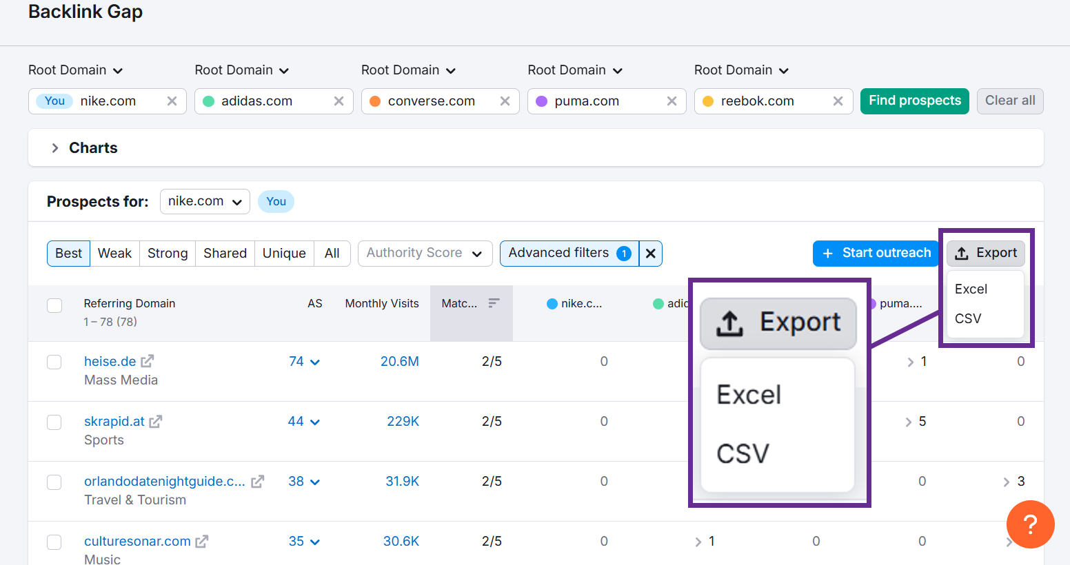 This will show you a list of domains that are linking to your competitors but not you. Click Advanced filters and select your target country to find results relevant to that particular region only.